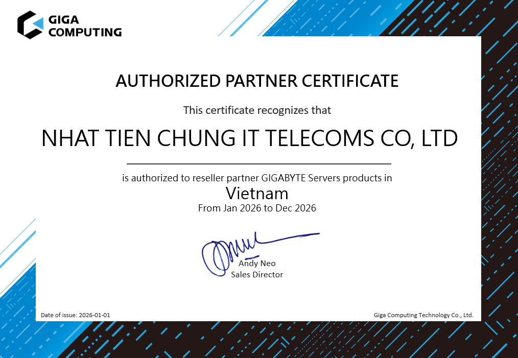 TP. Hồ Chí Minh, ngày 01 tháng 01 năm 2026 – Công ty TNHH Tin Học Viễn Thông Nhất Tiến Chung (NTC) trân trọng thông báo đã chính thức được chứng nhận là Nhà phân phối các dòng sản phẩm doanh nghiệp (Enterprise) của thương hiệu GIGABYTE tại thị trường Việt Nam.